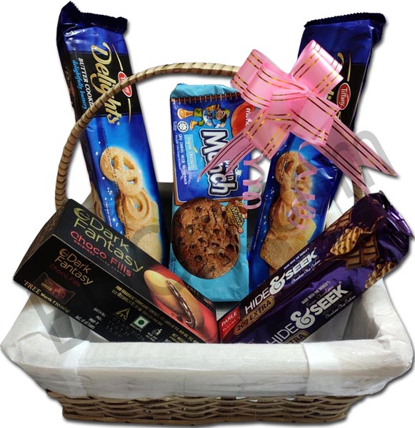 2 packet of tiffany delight chocolate chip cookies(each 90 gm), 150 Gm Zess cookies, Dark fantasy 75 gm, and 100 gm hide & seek cookies in a basket.