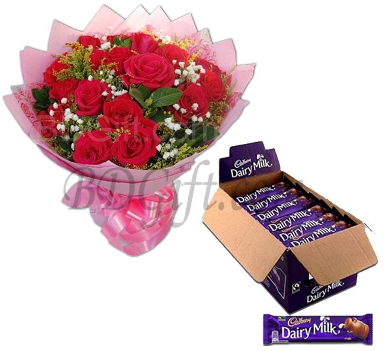 1 dozen red roses in bouquet with greens & fillers with 960 Gm Cadbury dairy milk chocolate 40 packet in a box ( Each packet 24 gm).