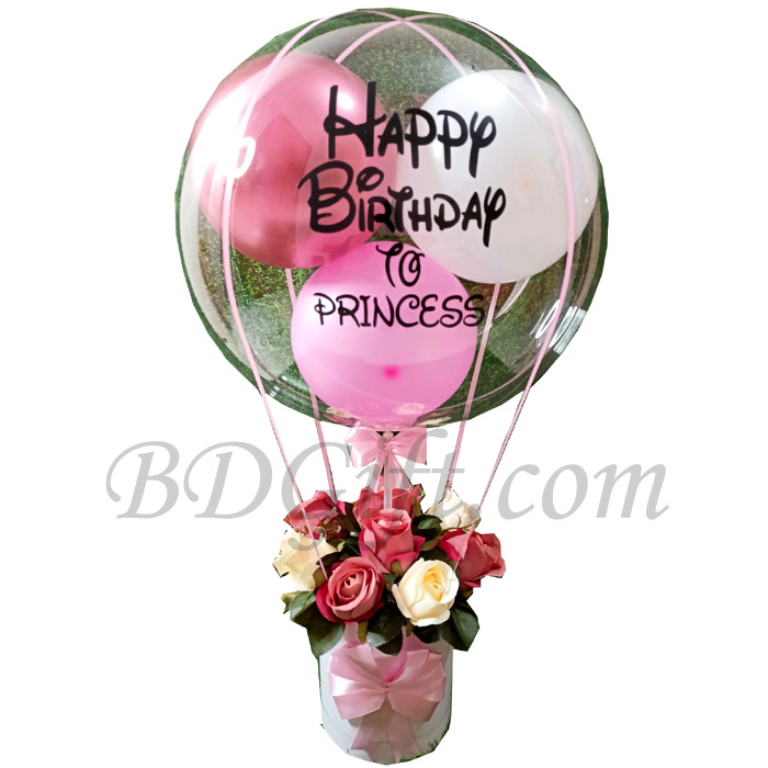 A gorgeous and glamorous 1 Big transparent balloons with 3 pcs multicolor smaller balloons (color may vary) & the worlds “Happy Birthday" & 10 pcs mix color roses (rose color depends on the availability of market) decorated in a round paper container with ribbon. (Container color may vary). You may change balloon writings according to your wish by 25 words