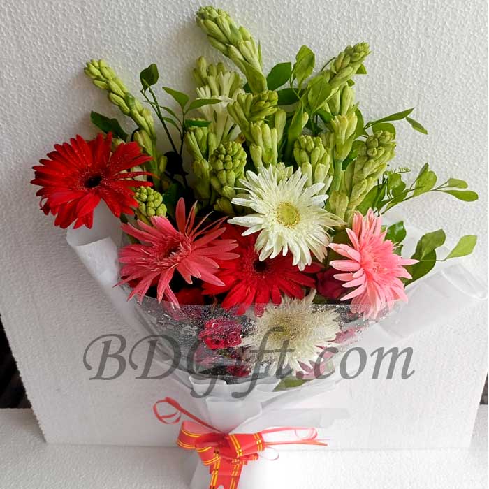 One dozen Rajanigandha and 6 pcs mix gerbera in a bouquet. Send this flower bouquet to your Loved ones who lives in Bangladesh that will brighten your special one's day.