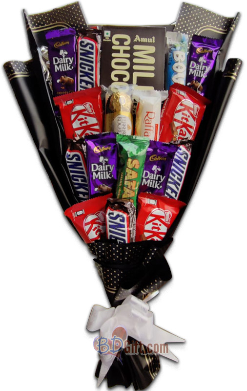 Enjoy in a luxurious chocolate bouquet featuring 1 Bounty, 1 Safari,1packet of 3pcs Raffaello,1packet of 3pcs Ferrero Rocher, 4 Dairy Milk, 4 KitKat 3-Finger, 150g of Amul Milk Chocolate, and 4 Snickers. Perfect for gifting on any occasion.
