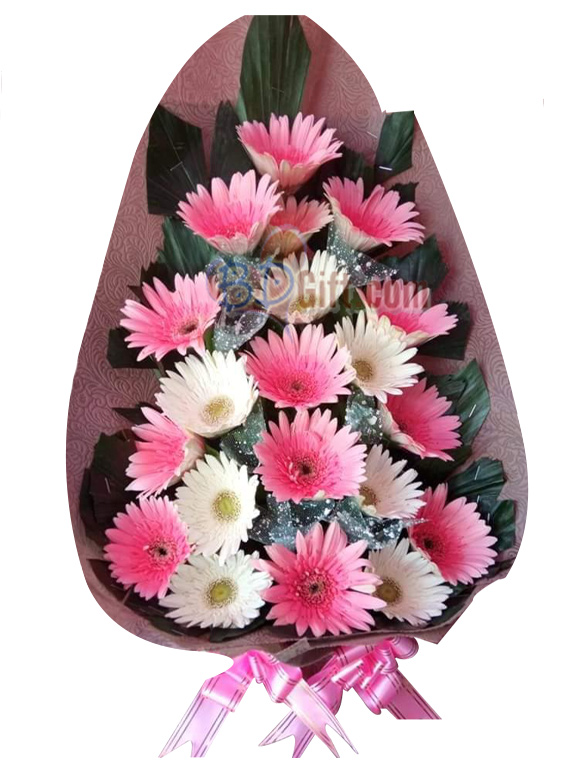 Brighten your special one's day with a vibrant bouquet of 20pcs pink & white Gerbera. Each bouquet is carefully arranged to showcase the cheerful and colorful blooms, making it a perfect gift for any occasion. Send this stunning arrangement to Bangladesh and bring smiles to your loved ones face.
