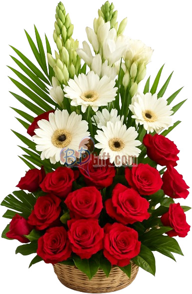 Send a touch of elegance and warmth to your loved ones in Bangladesh with this beautifully arranged flower basket. Featuring 15 red roses, 5 fresh white gerberas, and 3 Rajhanighandha (Tube Roses), this basket is a perfect blend of love, purity, and freshness.