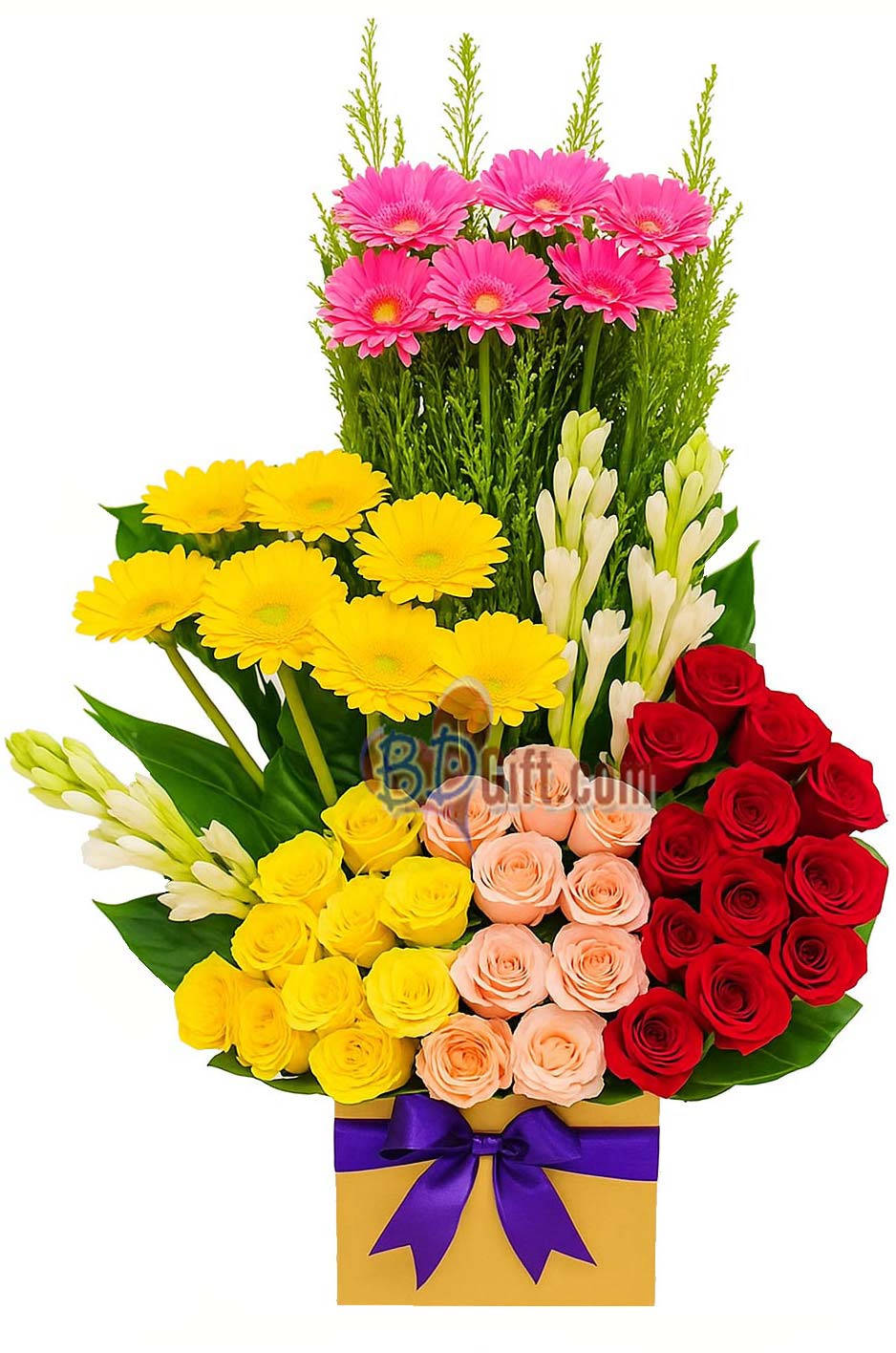 Celebrate life’s special moments with a basket of blooms — 12 red roses, 10 yellow roses, 10 pink roses, 7 yellow gerberas, 6 pink gerberas, and 3 Tube roses (Rajhanighandha). This delightful mix of colors and fragrances is a heartfelt way to express love, happiness, and warm wishes on birthdays, anniversaries, or any joyful occasion in Bangladesh.
