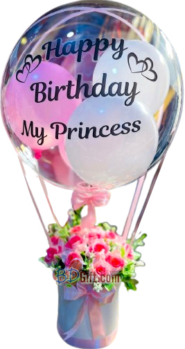 1 Big transparent balloon 2 pcs Pink & 2 pcs White smaller latex balloons & the worlds “Happy Birthday & 12 Pcs Pink artificial roses. decorated in a paper container with ribbon. (Container color may vary). You may change balloon writings according to your wish by 25 words.