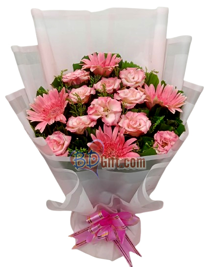 A charming bouquet of 6 pink gerberas and 10 Deshi pink roses, beautifully arranged to express love, care, and happiness.