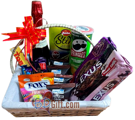 This gift basket includes: Chocolate Wafer Rolls, Cookies (100gm), Perk Chocolate bar 3 pcs(per pcs 30gm),Fox Candy(100gm),Tobelerone milk chocolate(100gm), Pringles Sour & Creme Onion(134gm),Biscuits(180gm)and Small Pie cake 4 pcs(per pcs 24 gm)and a bottle of sparkling juice(750ml), Gift wrapped in a gift basket.