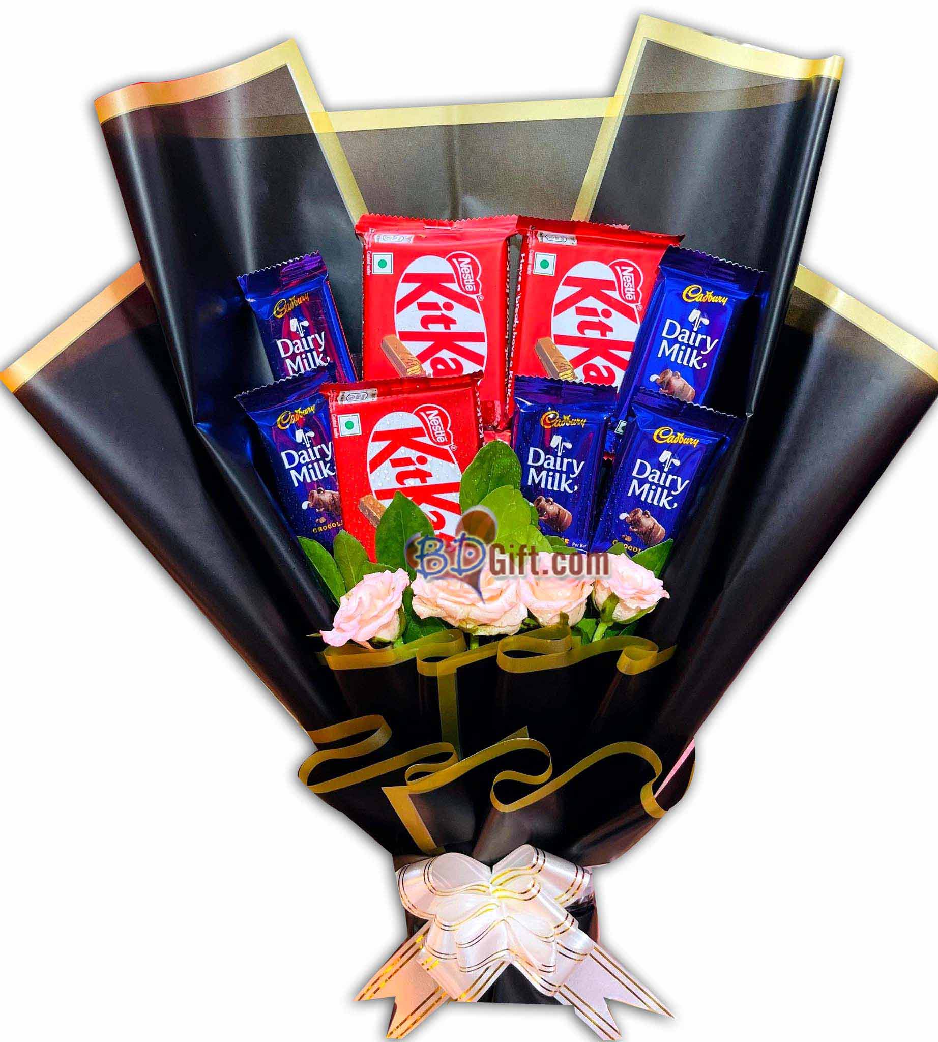 A sweet surprise of 4 Finger kitkat 3 pcs ( per pcs 37.5 gm ) & Dairy milk chocolate 5 pcs ( per pcs 23 gm ) & 4 pcs pink roses  the perfect blend of love and sweetness in one gift.