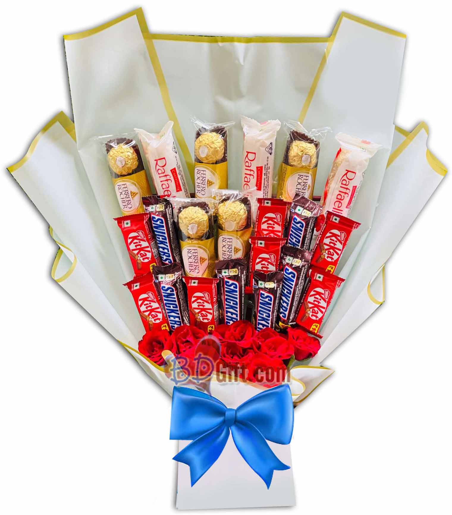 An indulgent gift of  Snikers chocolate 6 pcs ( per pcs 51 gm ),Ferrero Rocher Chocolate 5 Bars ( each 37 gm).Raffaello coconut Chocolate - 3 Bars( each 30 gm).kitkat chocolate 7 pcs ( per pcs 11.9 gm ), Red roses 10 Pcs the perfect mix of love, luxury, and sweetness