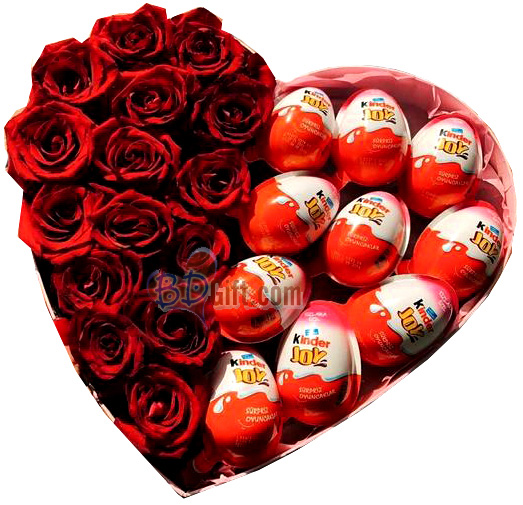 Love and sweetness combined — 24 red roses and 10 Kinder Joys in a romantic heart-shaped box.