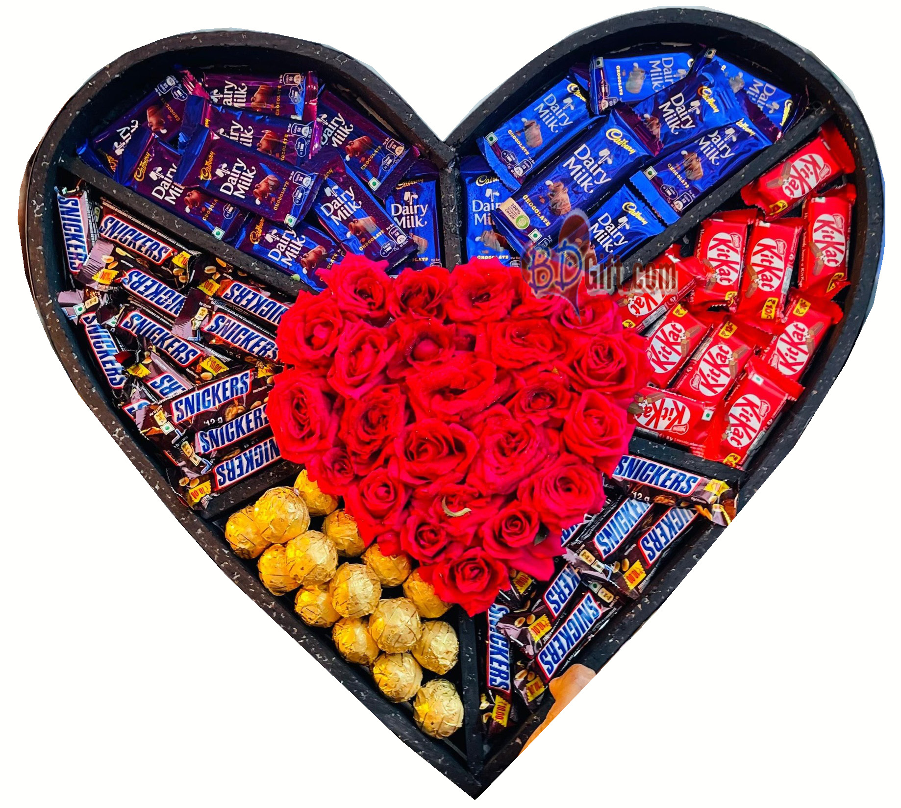 Surprise your loved one in Bangladesh with this heart-shaped chocolate and flower gift box.