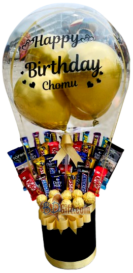 Make birthdays a delightful mix of sweetness and style. 1 Big transparent balloon with 3 pcs red & 4 pcs golden smaller latex balloons & the worlds “Happy Birthday" and Munch chocolate 4 pcs ( per pcs 8.7 gm) & perk chocolate 5 pcs ( per pcs 12gm) & kitkat chocolate 5 pcs (per pcs 11.9 gm) & 5 pcs Snickers chocolate (per pcs 20 gm) & 5star chocolate 5 pcs (per pcs 24 gm) & Dairy milk Chocolate 5 Pcs (per pcs 13.2  gm) & Toren chocolate 2 pcs & Ferrero Rocher chocolate 8 pcs.