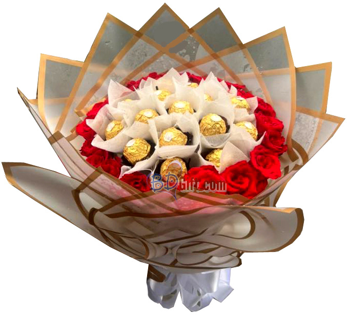 Celebrate love, elegance, and sweetness with our Golden Romance Ferrero & Red Roses Bouquet — a luxurious gift that perfectly expresses heartfelt emotions.