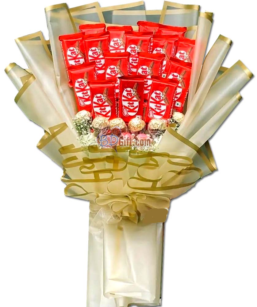 Treat your loved ones to a sweet and elegant surprise with this delightful gift combo. It includes 16 pcs KitKat chocolates (each 17gm), along with 6 pcs premium Ferrero Rocher chocolates for a rich and indulgent taste. To add a touch of beauty and softness, the set features a charming bouquet of 3 fresh pink roses, symbolizing admiration, sweetness, and affection.