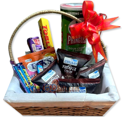 Tobelerone milk chocolate(100gm), Pringles Sour & Creme Onion (134gm), Hide & seek chocolate chips cookies 120gm, Fox candy 90 gm, Park chocolate 3 Pcs, Muffin cake 4 pcs in Basket.