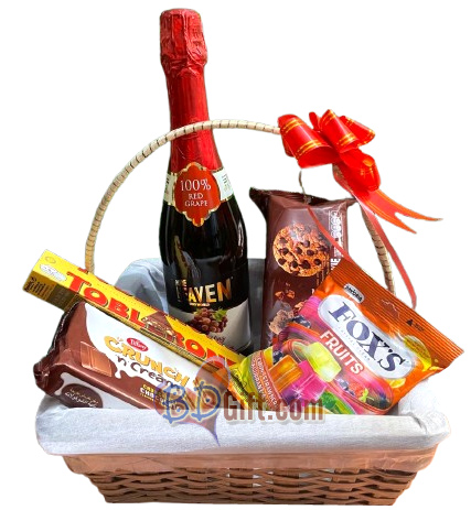 Celebrate special moments with this delightful Sparkling Celebration Gift Set, Sparkling non alcoholic Fruit Juice 750 ml, Tobelerone milk chocolate(100gm), Zess choco chip cookies 150gm, Fox candy 90 gm, Tiffany crunch n cream 76 gm in a Basket.