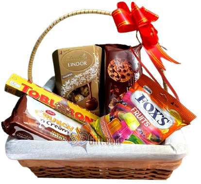 Lindt lindor 200 gm, Tobelerone milk chocolate(100gm), Zess choco chip cookies 150gm, Fox candy 90 gm, Tiffany crunch n cream 76 gm in Basket.
