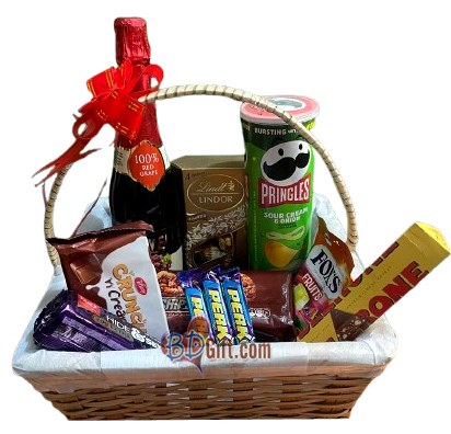 Send  Park chocolate 3 Pcs, Tiffany crunch n cream 76 gm, Toblerone milk chocolate(100gm), Hide & seek chocolate chips cookies 120gm, Fox candy 90 gm, Lindt lindor 200 gm, Zess choco chip cookies 150gm, Sparkling non alcoholic Fruit Juice 750 ml, Pringles Sour & Creme Onion(134gm) in a Basket  to Bangladesh.