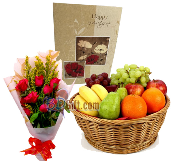 This thoughtfully arranged combo includes fruit basket which contains 1 kg Apples,1 kg Malta, half kg Grapes, 12 pieces banana and 1 kg Guava with 9 Pcs red roses Bouquet,new year card send to Bangladesh.