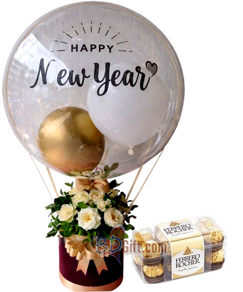 New Year Balloon, White Roses & Ferrero Combo