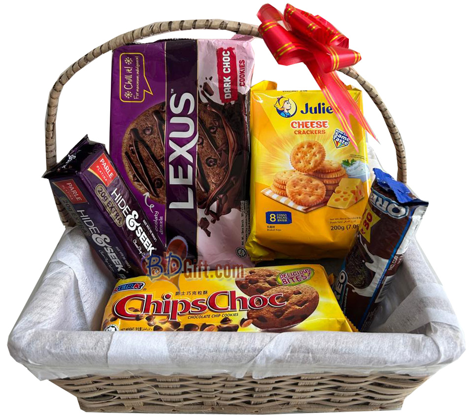 Delight your loved ones in Bangladesh with this tasty snack combo featuring a mix of premium cookies, biscuits, crackers, and chocolate treats. Perfect for sharing, gifting, or enjoying with tea, this assortment includes Lexus Dark Chocolate Cookies, Cheese Crackers, Chips Choc Cookies, Hide & Seek, and Oreo Biscuits. A thoughtful and delicious gift for any occasion.