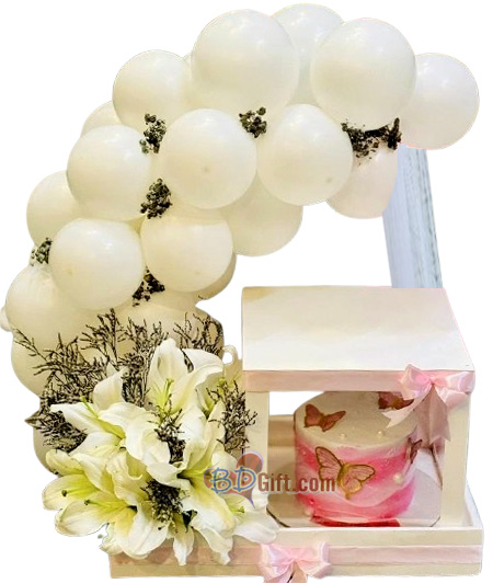 Make any celebration special with this elegant white balloon hamper featuring a 2-pound delicious vanilla cake and a beautiful artificial lily arrangement. A perfect gift choice for birthdays, anniversaries, and special occasions, delivered safely anywhere in Bangladesh.