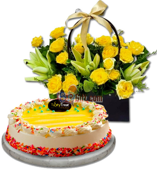 A cheerful and elegant gift combo featuring yellow roses with a lily arranged in a bag and a half kg round vanilla cake from Tasty Treat, recommended for up to four people. Perfect for birthdays, congratulations, and happy occasions.
