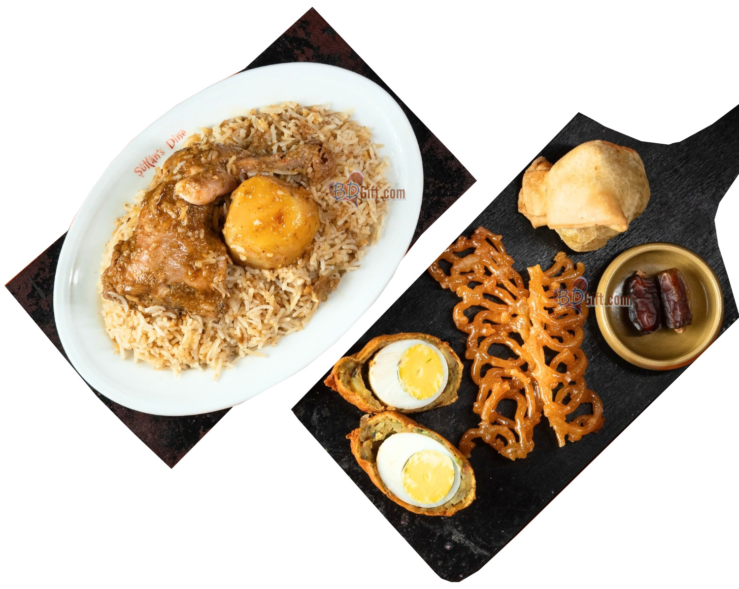 Send a delicious Iftar meal from Sultan Dines to your loved ones anywhere in Bangladesh. This special Iftar combo includes Chicken Dom Biryani, Khejur (Dates), Jilapi, Egg Chop, Singara, and Water for 1 person — a perfect traditional arrangement to break the fast during Ramadan.