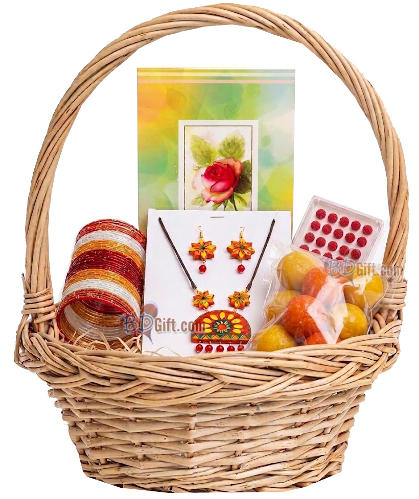 Celebrate the beauty of Pohela Boishakh by sending a charming traditional gift basket to your loved ones in Bangladesh. This basket combines colorful accessories with delicious sweets—perfect to embrace the festive spirit.
