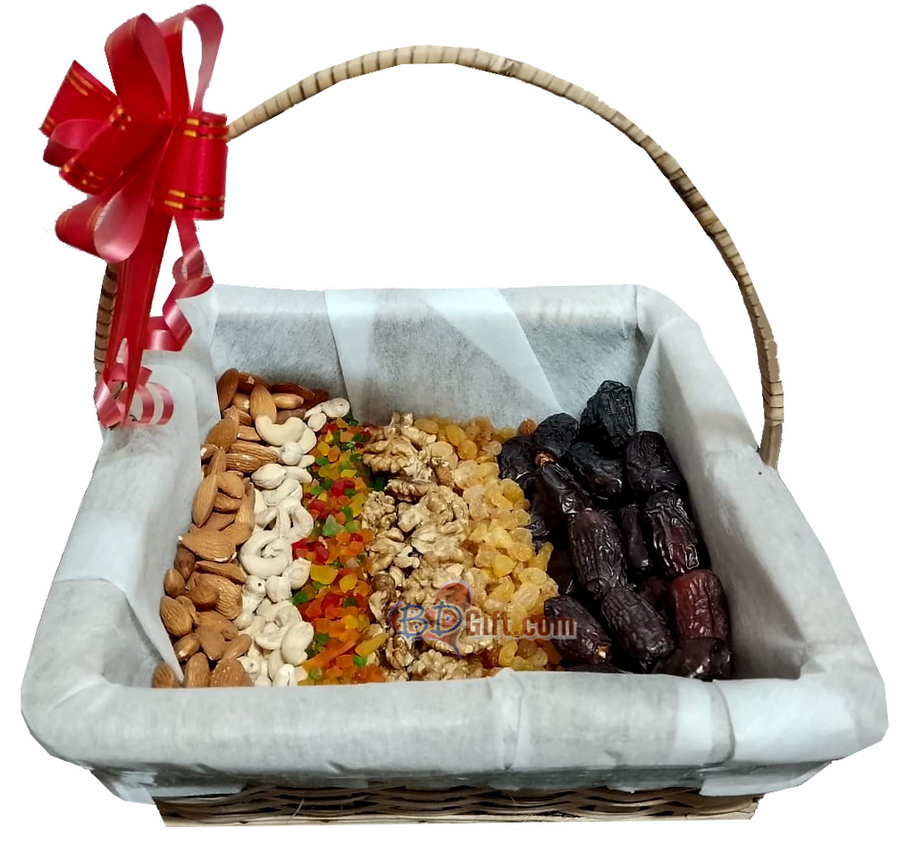 Send a wholesome and thoughtful gift to your loved ones in Bangladesh with this beautifully arranged dry fruits basket. Packed with nutritious and delicious items, this combo is perfect for expressing care, love, and good health. This gift includes: Raisin – 100 gm Almonds – 100 gm Cashew Nuts – 50 gm Dates – 250 gm Walnut – 100 gm Tutti-Frutti – 100 gm All items are neatly arranged in a decorative basket (basket design may vary based on availability), making it a healthy and elegant gift choice for any occasion.