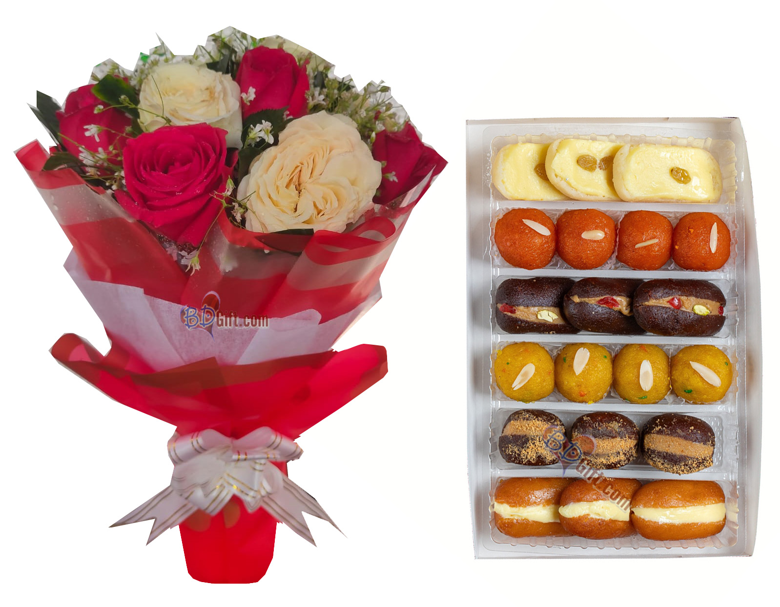 Send a beautiful bouquet of 6 pcs off-white roses & 6 pcs red roses paired with al mithai box to your loved ones in Bangladesh.