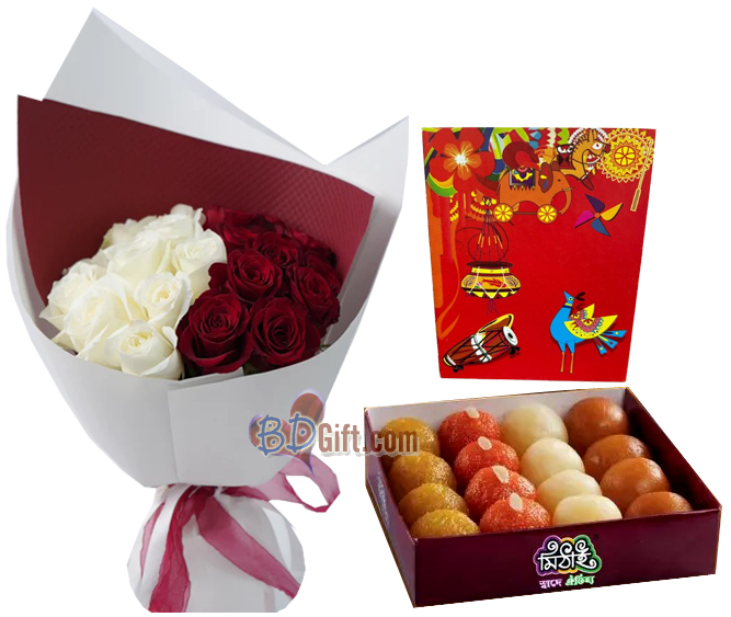 Elegant bouquet of 12 off-white roses and 12 red roses and Boishakhi card comes with a delicious mithai box including: