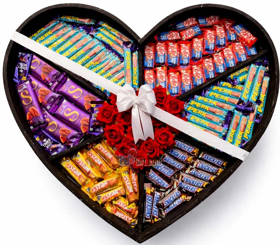 A premium chocolate gift combo arranged in a beautiful heart-shaped box.Perfect for birthdays, anniversaries, love surprises, and special occasions.