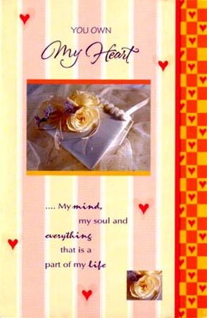 3 folder Love card with the text of" YOU OWN My Heart... My mind, my soul and everything that is a part of my life" & the inside text" My Heart... And in your Love, as each day unfolds, I find many more reasons for happiness in my life.I BELONG to You. Size 9 inch to 6 inch with nice envelope.