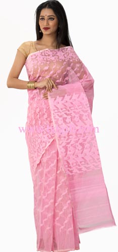 Traditional Light Pink Dhakai Jamdani sharee With Jari Border. Exclusive Collection of a Brand name Fashion house with thread jamdani work on achol, par & all over body.