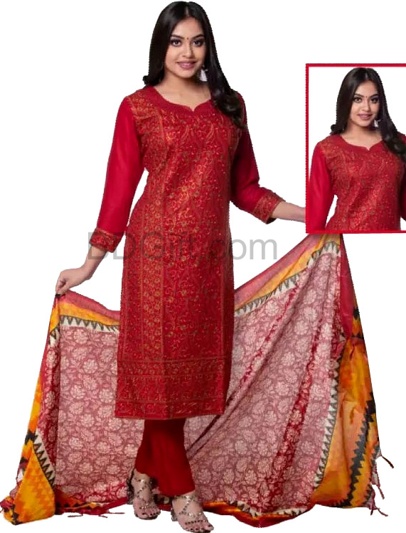 Exclusive lilen salwar kamiz. Exclusive collection of Brand name fashion house with exclusive design in front of the Kameez with matching Orna & Salwar.Send this lovely dress to your loved ones on this Eid.
