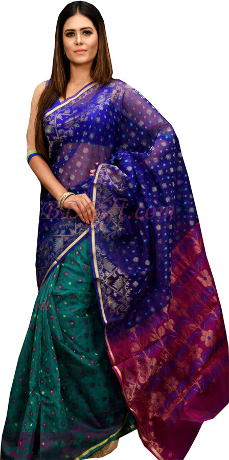 Jamdani blue color Saree.  Jamdani work on all over the body. Matching blouse is included with the sharee. Surprise your dear by gifting this sharee to any kind of occasions. Color may little bit vary than picture due to light source.