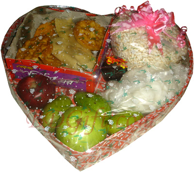 Best gift package to wish some one on the occasion of first day of bangla new year . This package includes cup cake - 1pc, Apple - 1pc, Guava - 1pc, Mango - 3pcs, Fuljhuri - 2pcs, Nokshi pitha - 2pcs,Narikel puli - 2pcs, Patishapta - 2 pcs, Pata pita-2 pcs,Khoi - 1 small packet, Batasha - 1 small packet decorated in a basket.