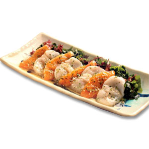 Scallop & Salmon Wafu Carpaccio from Sushi Tei restaurant. This item contains Japanese style raw scallop & salmon carpaccio. This item is available in lunch & dinner time.